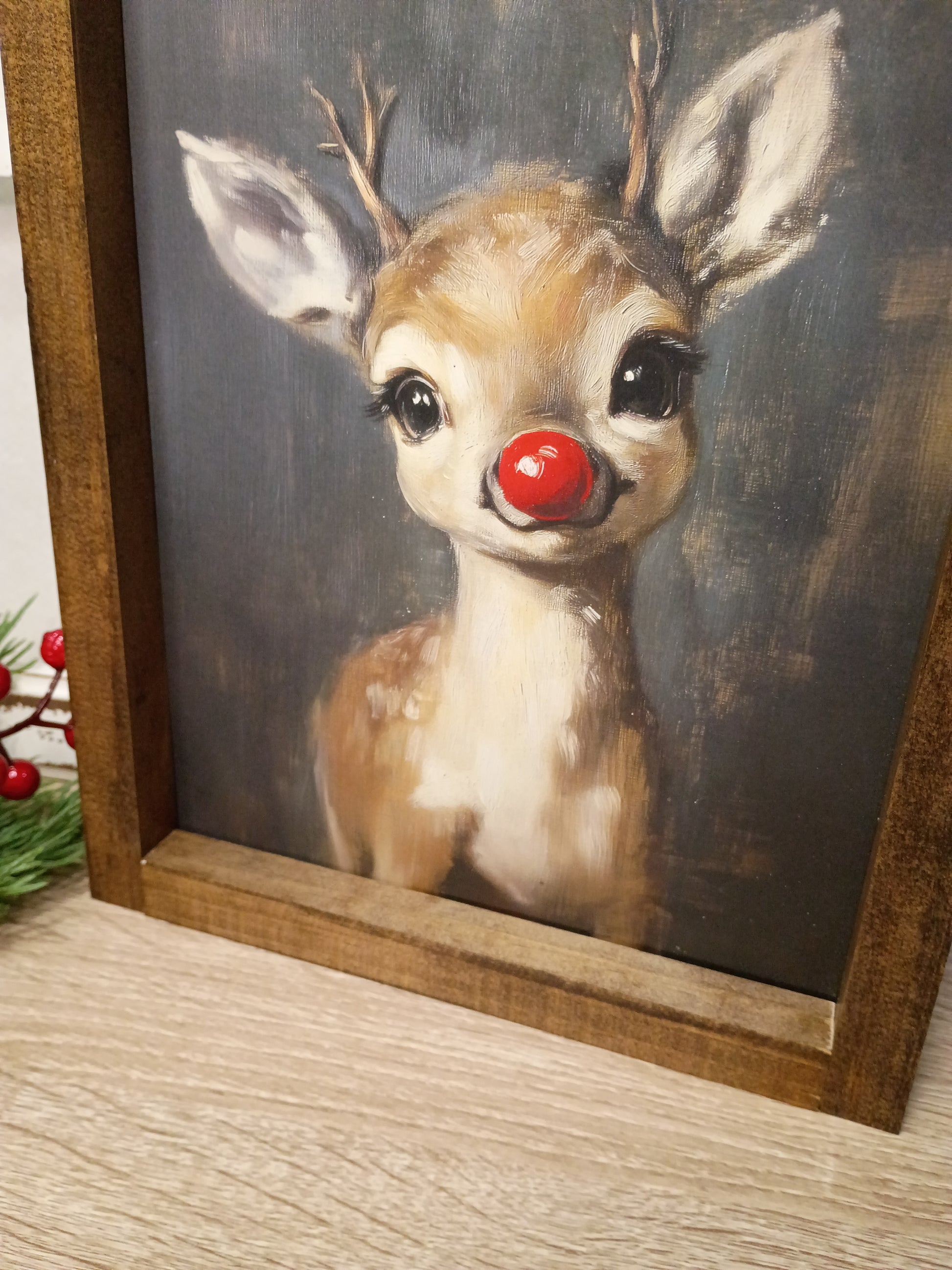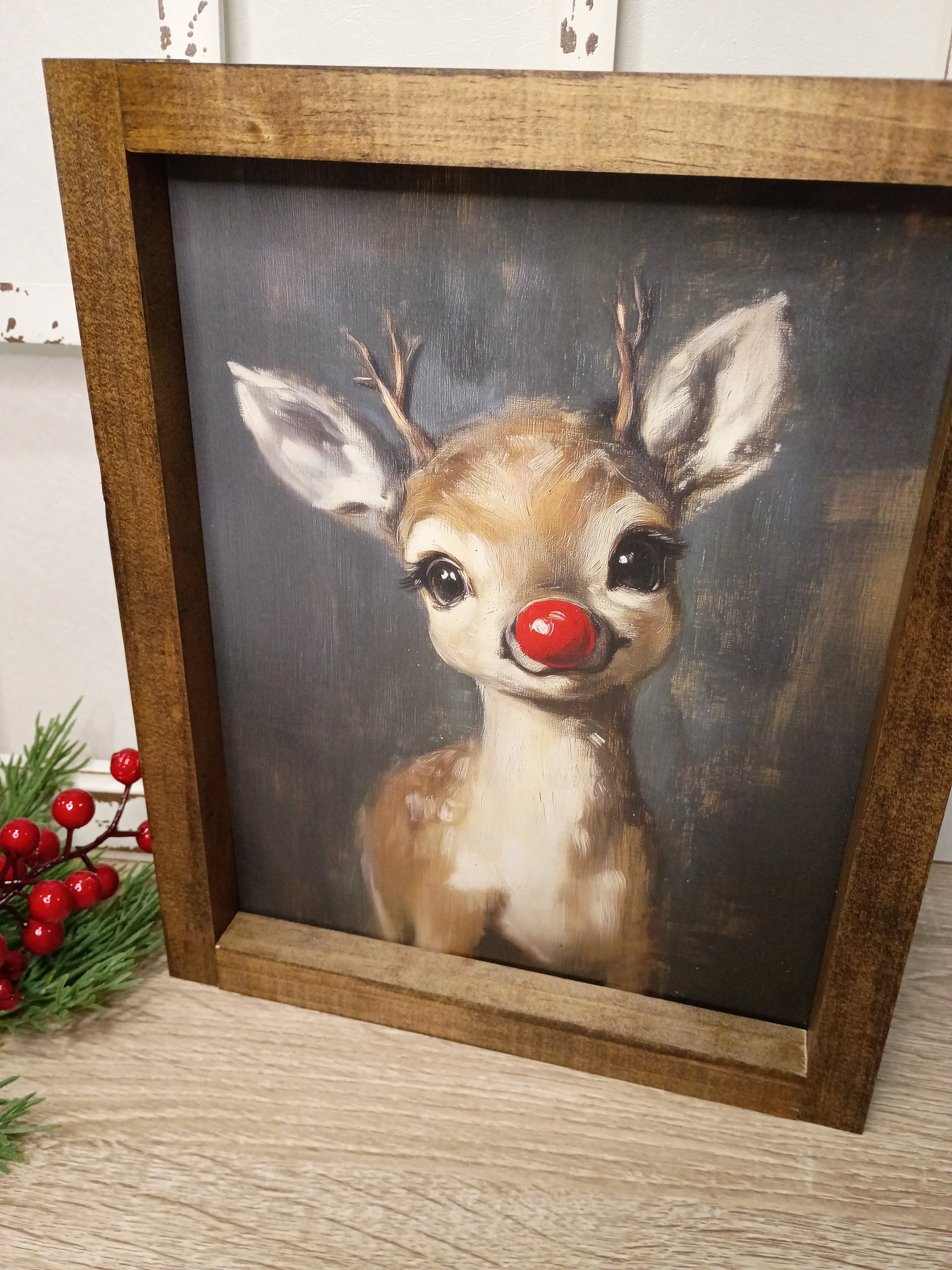 Elevate your home decor with this Vintage Reindeer Framed Farmhouse Style Sign. The print is expertly framed in 1 x 2 lumber stained in a rich dark walnut, adding a timeless, sophisticated charm to any space. Designed for versatility, it can be hung on your wall (hardware not included) or elegantly displayed on a shelf or mantel, making it a perfect accent for your living room, entryway, or cozy nook. This framed sign seamlessly blends rustic farmhouse appeal with refined design to enhance your interior aesthetic.
