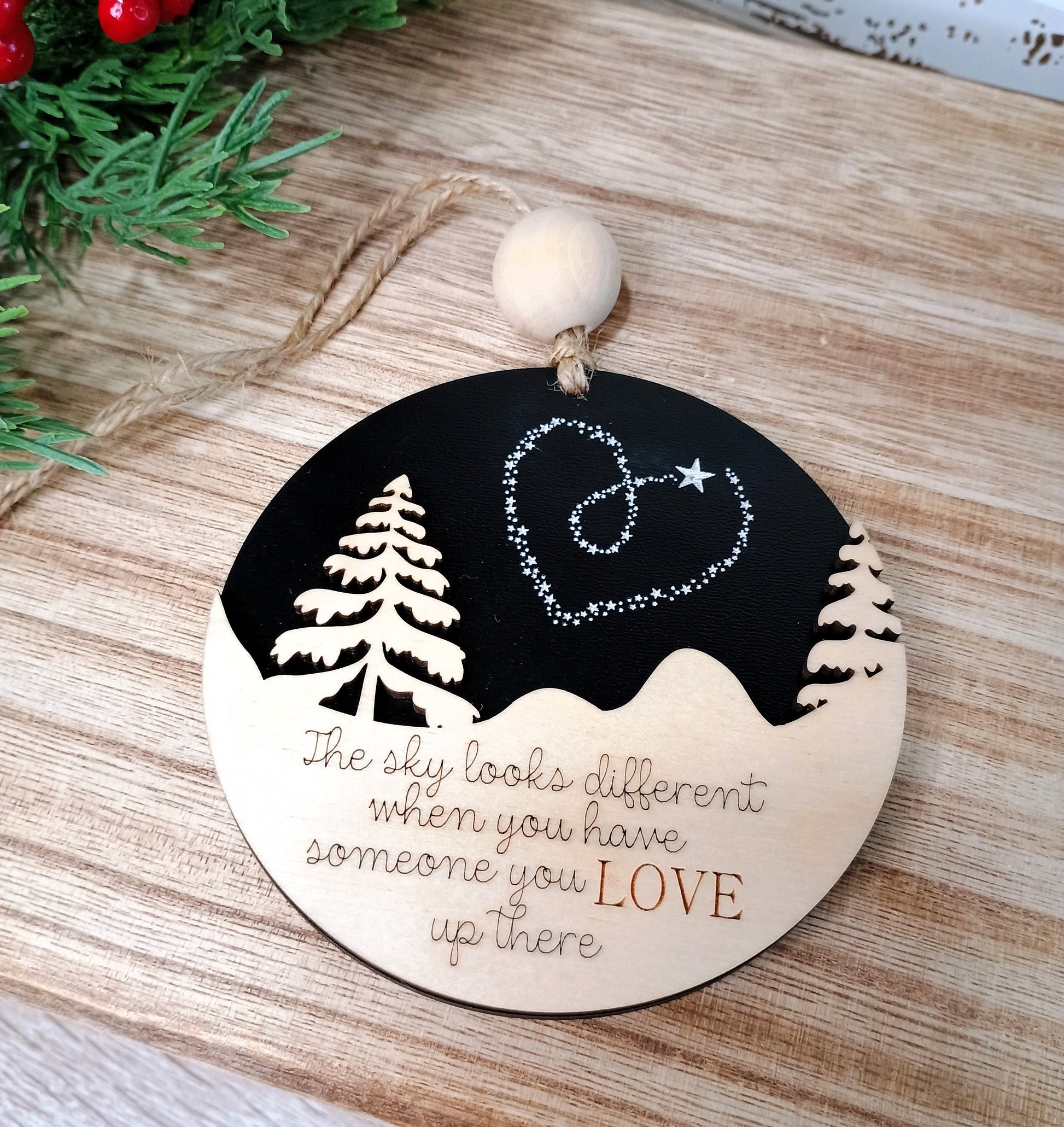 The Sky Looks Different Memorial Ornament is thoughtfully laser cut from wood, capturing delicate detail with warm, natural charm. This heartfelt keepsake makes a perfect gift for a loved one who has experienced loss, offering a gentle reminder that even when the sky changes, memories shine on. Its unique design invites reflection and comfort, adding a personal touch to any space. Celebrate cherished moments with this beautifully crafted token of love and remembrance.